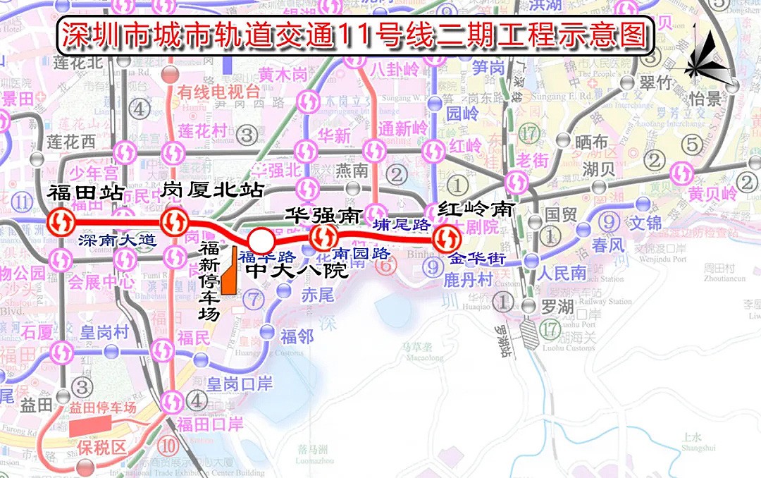 項(xiàng)目概況:深圳地鐵11號(hào)線二期起于崗廈北站(不含),主要沿深南大道、福華路、南園路、埔尾路、金華街敷設(shè),止于紅嶺南站,線路全長約4.39千米,共設(shè)3座車站:中大八院站、華強(qiáng)南站、紅嶺南站,深圳地鐵11號(hào)線二期建成后,將進(jìn)一步實(shí)現(xiàn)深圳東西向發(fā)展主軸中心間的快速通達(dá),串聯(lián)起西部寶安區(qū)、南山區(qū)與東部羅湖區(qū),實(shí)現(xiàn)城市主次中心的快速連接,助力建設(shè)軌道上的大灣區(qū)