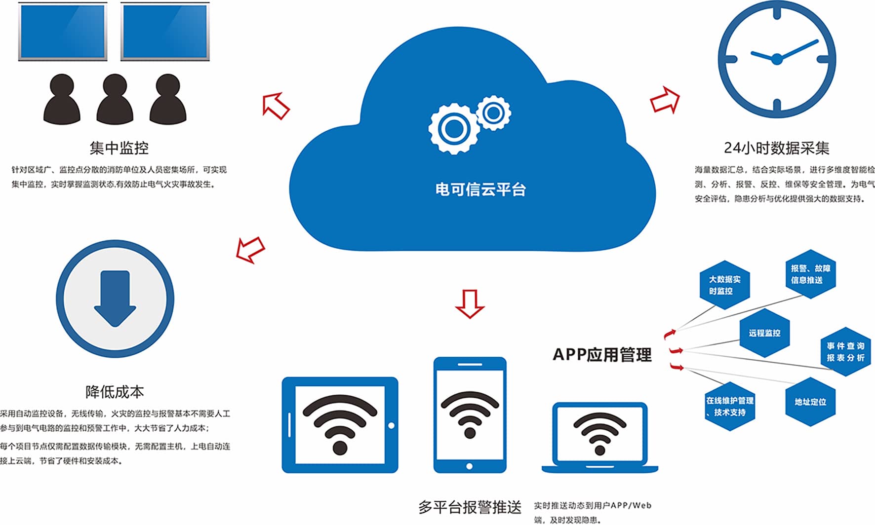 那么,“智慧用電”是什么呢?它是對電路中主要引起火災的因素,如剩余電流、線纜溫度、電流等參數(shù)進行不間斷的數(shù)據(jù)監(jiān)測與數(shù)據(jù)分析,實時的傳輸?shù)浇K端,通過物聯(lián)網(wǎng)技術,讓用戶隨時隨地可以監(jiān)測數(shù)據(jù),并即時發(fā)送異常報警信息的一套系統(tǒng)。該系統(tǒng)可以有效解決生產(chǎn)經(jīng)營企業(yè)、商場、醫(yī)院、住宅區(qū)等人員密集場所中,線路老化、無專業(yè)電工排查、無法實時監(jiān)管等問題,讓用電更加安全,更加有保障。和遠智能智慧式用電安全隱患監(jiān)管服務系統(tǒng)可以隨時獲取第一手的用電情況,數(shù)據(jù)在云平臺進行數(shù)據(jù)提取、挖掘、分析、總結,實現(xiàn)全天候的用電實際監(jiān)控。