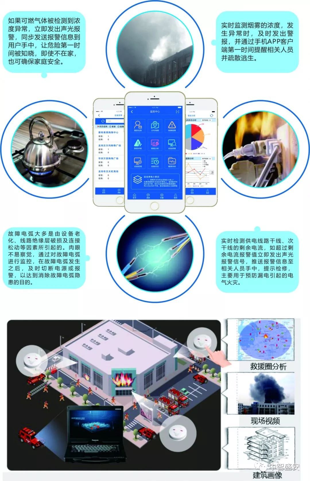 中智盛安自主研發(fā)的智慧安全系列品牌產(chǎn)品以信息共建共享、互通互聯(lián)、監(jiān)管群防群治、實(shí)時(shí)實(shí)效,救援聯(lián)勤聯(lián)動(dòng)等目標(biāo),實(shí)現(xiàn)智能預(yù)警、迅速響應(yīng)、合理調(diào)配、消防聯(lián)動(dòng),最大程度保障城市安全。
