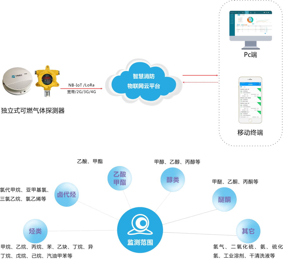 可燃?xì)怏w監(jiān)控系統(tǒng)由獨(dú)立式物聯(lián)網(wǎng)燃?xì)馓綔y(cè)器、監(jiān)控云平臺(tái)、手機(jī)APP組成。燃?xì)馓綔y(cè)設(shè)備各自獨(dú)立供電、互不影響,同時(shí)克服傳統(tǒng)燃?xì)馓綔y(cè)器無(wú)法聯(lián)網(wǎng)和聯(lián)網(wǎng)布線麻煩的缺點(diǎn),獨(dú)立安裝,無(wú)線聯(lián)網(wǎng),大幅提高消防施工效率和智慧化水平。